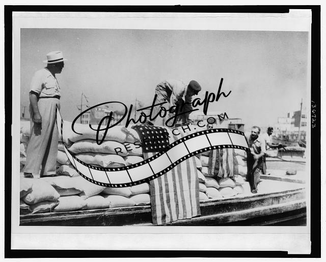 Summary: Photograph shows munitions, part of American military aid to Greece, being loaded onto a cargo ship in New York City.
