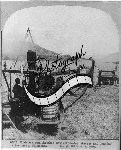Modern steam thresher with self feeder, stacker and bagging attachment. Californ