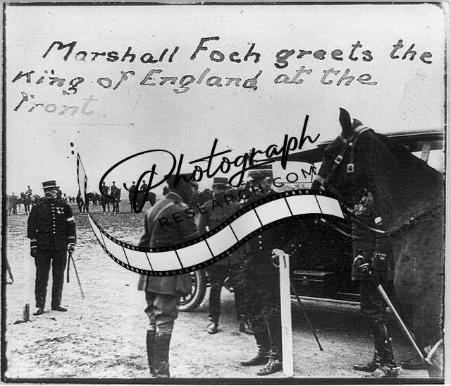Marshall Ferdinand Foch greets,King of England at front,George V,World War,c1919