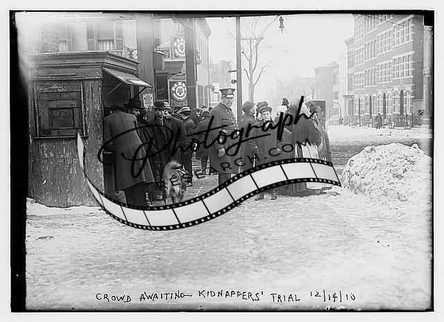 Crowd awaiting kidnappers trial,Policeman,snow,December 14,1910,street