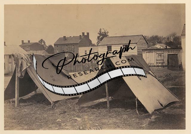 Two small tents,with wood frame buildings in the background,July 6,1865,Russell