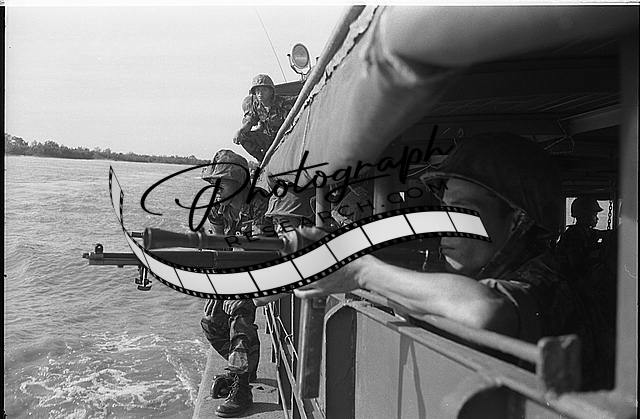 Vietnamese soldiers inspecting the delta shoreline from inside a boat to prepare for landing