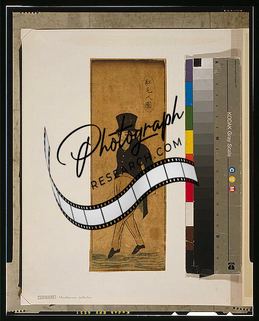 Clipping from a catalog on mat: 'American merchant delightedly gazing at a dwarf tree in bloom. In the corner is a vignette of a lady in a bonnet of the period. The man is resplendent in a green frock coat, holding a long stick. By Sadahide, 1861. Moriji, publisher. Mino, Engraver.'