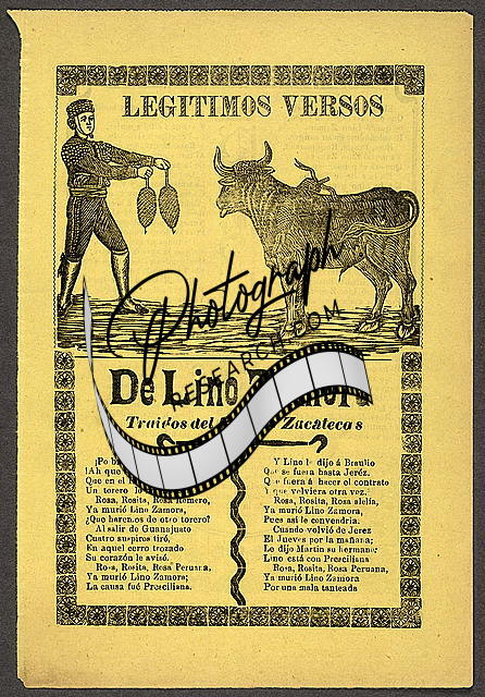 Summary: Broadside shows, on verso, a bust portrait of bullfighter Rodolfo Gaona. The text includes three songs: 'When love dies;' 'Gaona dies or not,' which conveys how Gaona was gored July 5, 1909 and whether or not he has cheating death; and 'The palm,' in which a scortched palm tree is used as a metaphor for a heart being hurt due to love denied.