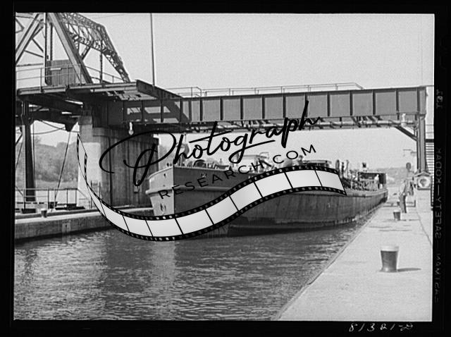 Title: Oil carrier settles in lock as the flood gates are opened. Amsterdam, New York