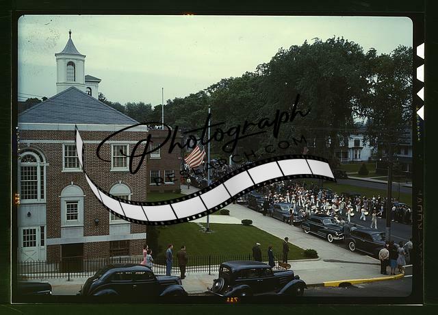 Title: An American town and its way of life, Southington, Conn. The Memorial Day parade moving down the main street. The small number of spectators is accounted for by the fact that the town's war factories did not close. The town hall is in the left foreground. May 23 to May 30