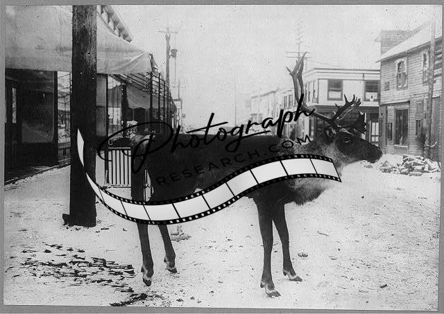 Stuffed reindeer on street,butcher's sign,Dawson,Yukon Territory,Canada,1900-23