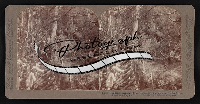Tame elephants breaking down timber in Stockade after "drive in"--Kraal 1902, Ce