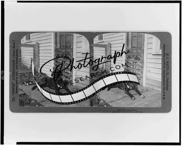 Photo of Stereograph,Who rung central?,Dog lies on porch,cat plays with tail