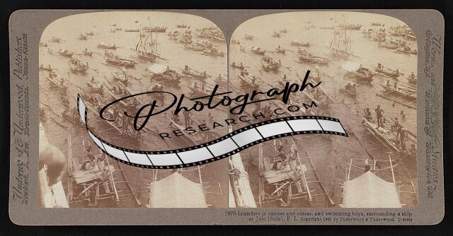 Islanders in canoes and vintas, and swimming boys, surrounding a ship at Jolo (S