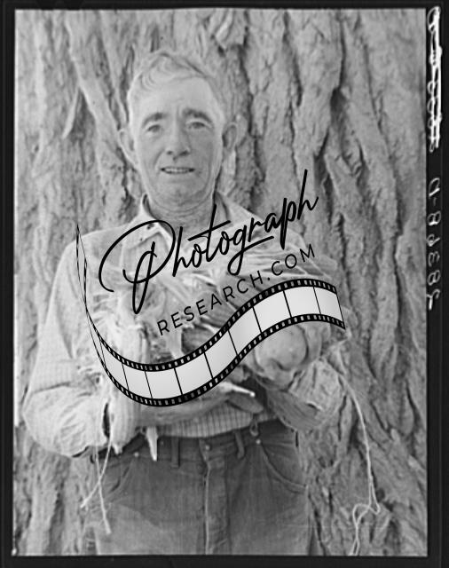 Title: Andy Bahain, FSA (Farm Security Administration) borrower, showing some of the potatoes produced on his farm near Kersey, Colorado