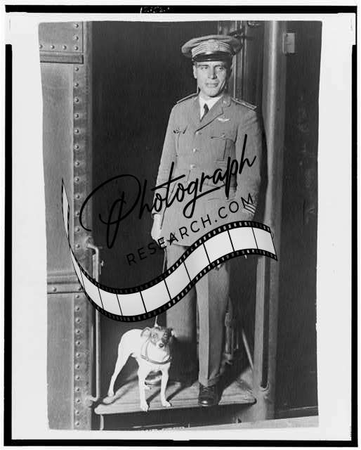 Umberto Nobile,dressed in military uniform in a doorway with his dog,Titina,1926