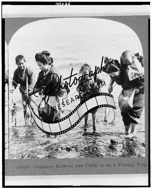 Japanese mothers,children on a fishing trip,Japan,c1919,Stringers of Fish