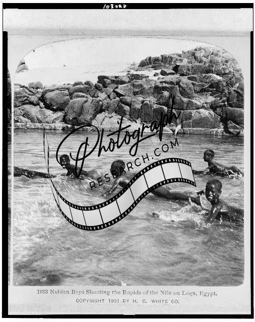 Nubian boys shooting the rapids of the Nile on logs,Egypt,c1901,Children Playing