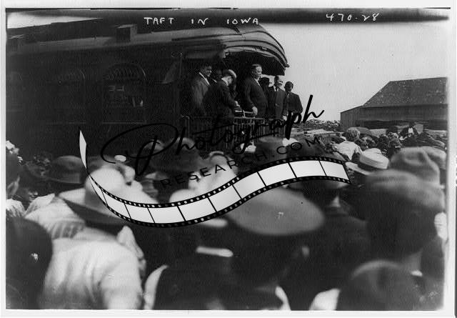 William Howard Taft campaigning from back of train,Iowa,IA,1908,crowd of people