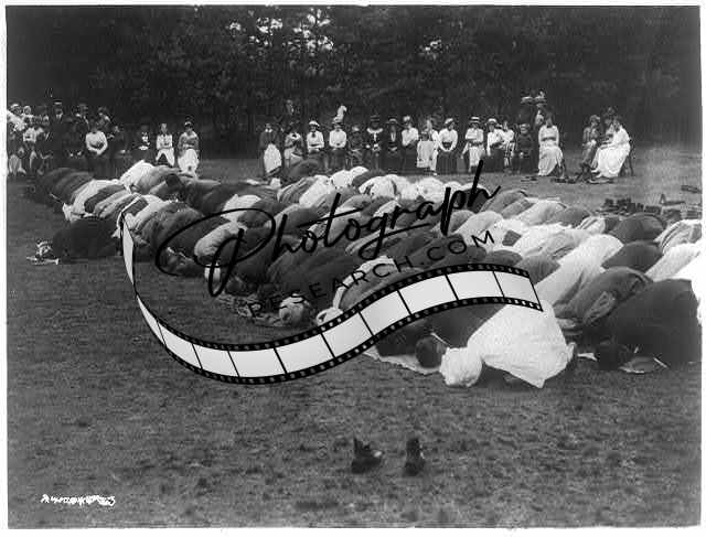 Mohammedans kneeling with heads on ground at prayer,Weking,near London,England