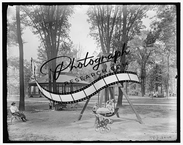 Scene,landscape pavilions,swings,children,Clark Park,Detroit,Michigan,MI,1900