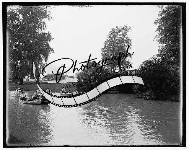 Bridge entrance,canal,canoes,boats,Belle Isle Park,Detroit,Michigan,MI,1900