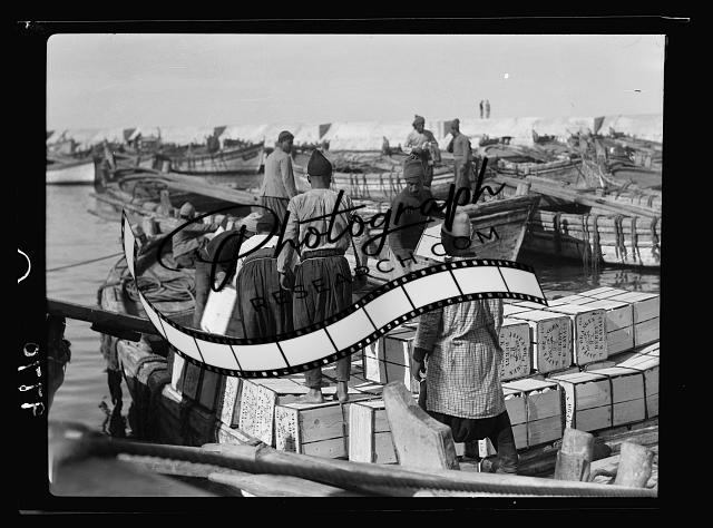 Lighters loaded with orange boxes for shipment,Agriculture,American Colony
