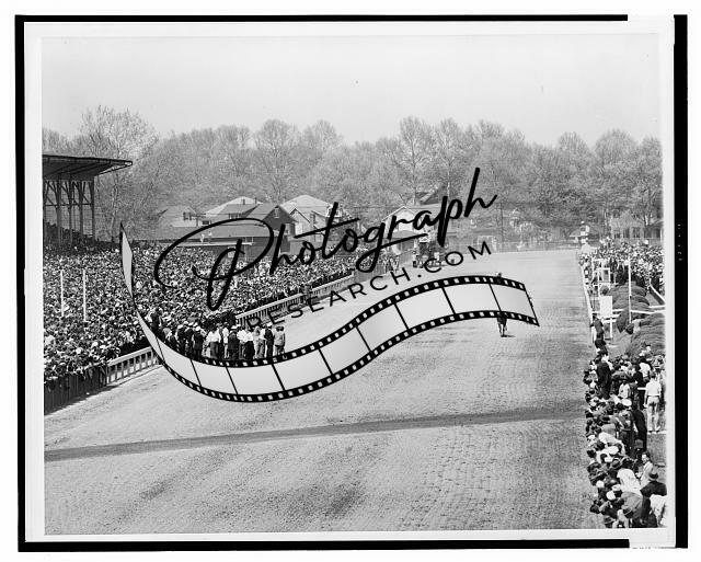 Horses on racetrack approaching the finish line, Preakness Stakes at Pimlico track in Baltimore, Maryland.