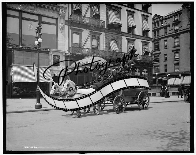 Fifth Avenue,5th,stage,streets,stagecoaches,tourists,buildings,New York,NY,1900