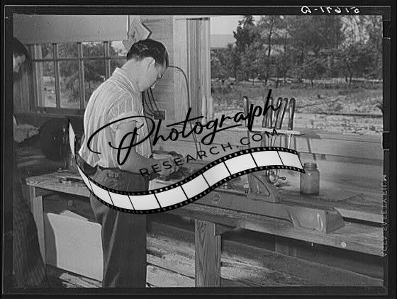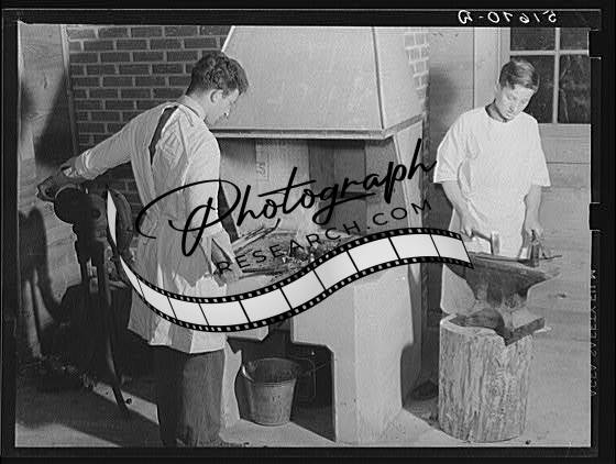 Title: Part of shop class in school with Robert Gentry, teacher, in center at machine. Ashwood Plantations, South Carolina