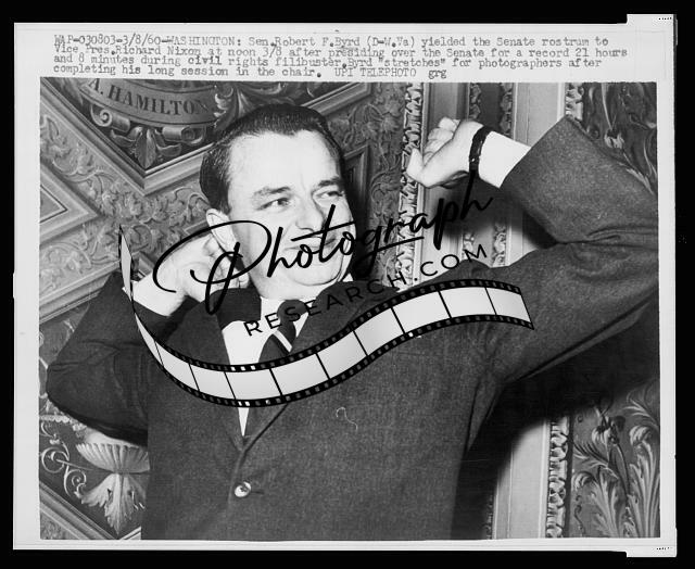 Sen. Robert Byrd, half-length portrait, arms in air stretching at the conclusion of his 21 hour 8 minute civil rights filibuster in the Senate