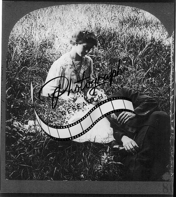 Sovereigns of love's domain,c 1906,man laying head in womens lap in a meadow