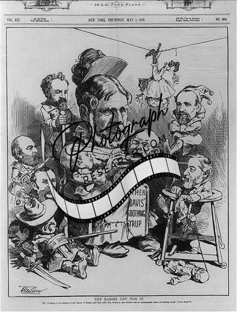 Babies Cry for it,1879,Cartoon,Mother Davis feeding Roscoe Conkling,syrup