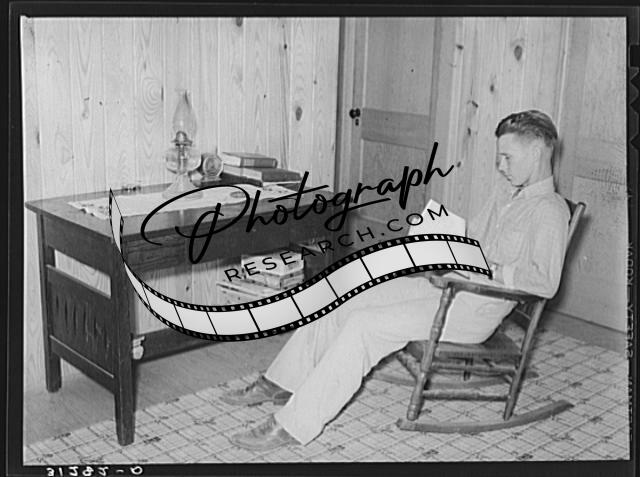 Title: The daughter of the Atkinson family, doing her homework in corner of living room of new farm home. Southeast Missouri Farms