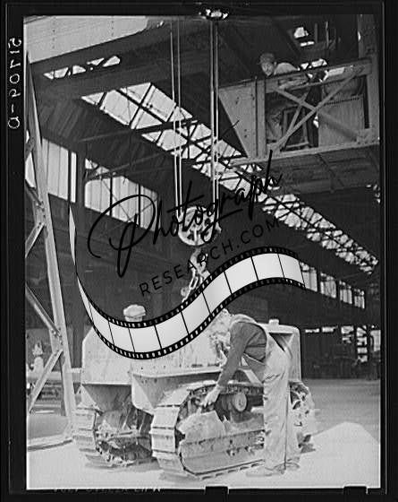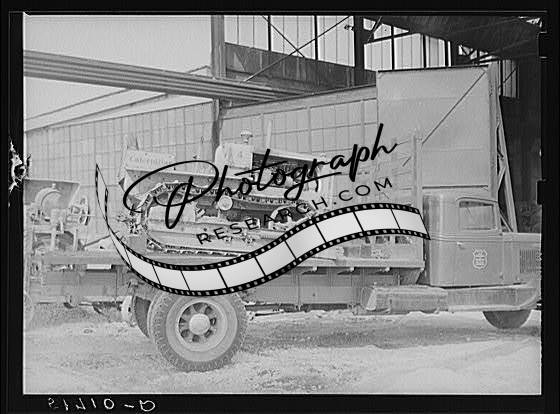 Title: Hooking shepard crane to tractor preparatory to hoisting it off truck to repairs shop in FSA (Farm Security Administration) warehouse depot. Atlanta, Georgia