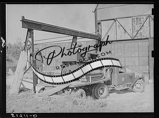 Title: Tractor is brought into repair shop in FSA (Farm Security Administration) warehouse depot by Shepard crane. Atlanta, Georgia