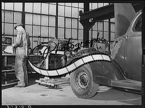 Title: Painting crank-car with sprayguns at FSA (Farm Security Administration) warehouse depot. Atlanta, Georgia