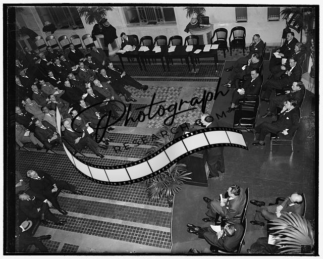 Title: Attorney General and FBI head arrive at U.S. Attorneys Conference. Washington, D.C., April 19. Attorney General Frank Murphy and FBI Chief J. Edgar Hoover pictured as they arrived at the Department of Justice today to attend the first conference of United States attorneys