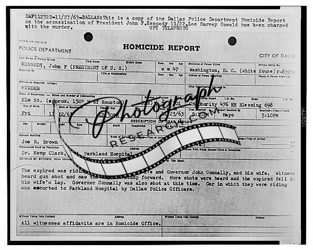 This is a copy of the Dallas Police Department Homicide Report on the assassination of President John F. Kennedy 11/22. Lee Harvey Oswald has been charged with the murder