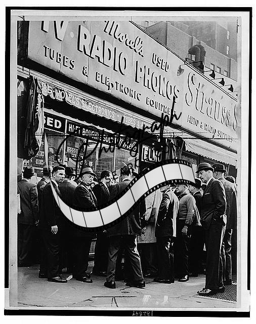 Crowd listens to Radio Shop,Greenwich & Dey Streets,President Kennedy,1963