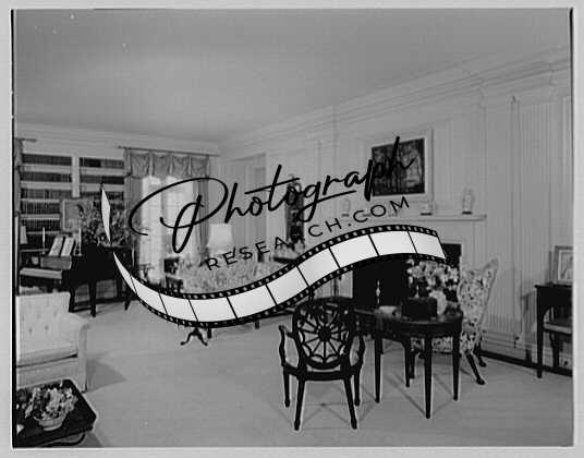 Title: Auchincloss residence, McLean, Virginia. Living room, to couch, with dog