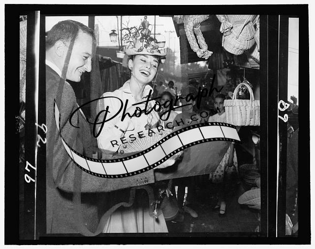 Audrey Hepburn trying on a hat in a Mexican market while her companion holds a mirror