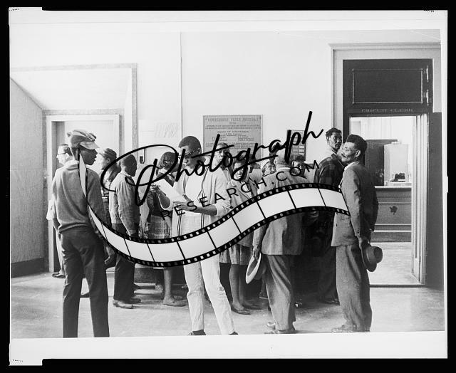 African Americans at the entrance to the "Circut Court" room waiting to register to vote