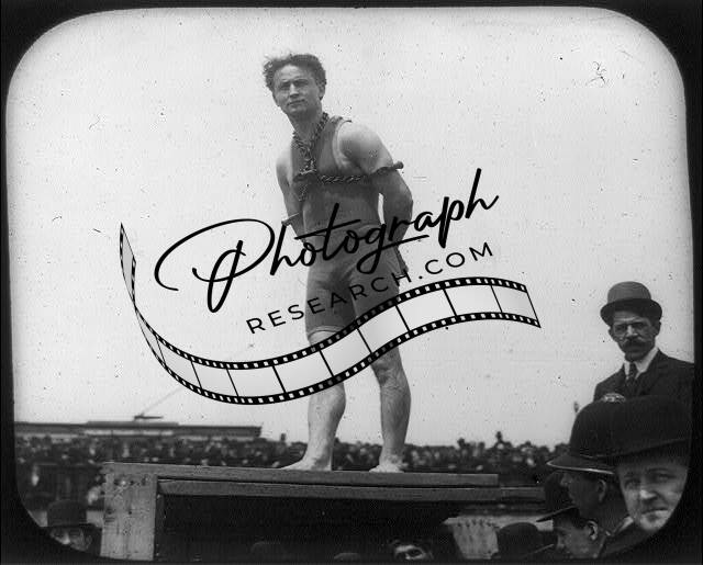 Harry Houdini,bathing suit,chains,platform,crowd,magician,performances,c1906