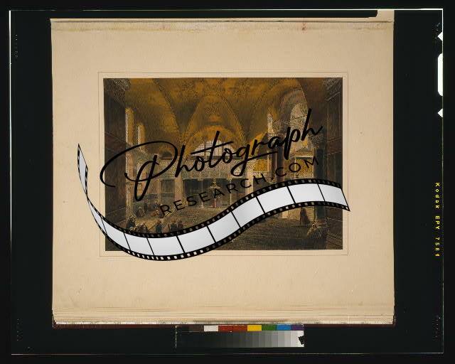 Summary: Print shows interior of gynaeceum of Ayasofya Mosque, formerly the Church of Hagia Sophia; with groups of men, women, and children in traditional dress.