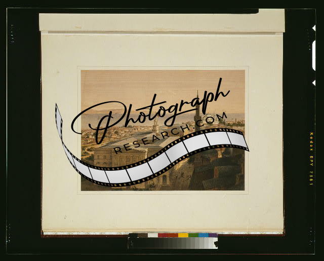 Summary: Print shows a section of a panorama of Istanbul made from a minaret of Ayasofya Mosque, formerly the Church of Hagia Sophia, including St. Irene Church, the treasury, the mint, and the walled gardens around Topkapi Palace.