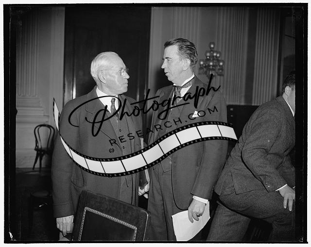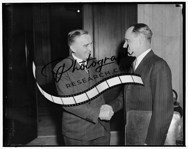 Title: Scheduled to tell Monopoly Committee of iron firm's financing. Washington, D.C., Dec. 14. B.A. Tomkins on the Bankers Trust Co. of New York City, photographed with Sen. Joseph O'Mahoney, Chairman of the Monopoly Committee, is scheduled to tell the committee sometime today of the financing of the Cleveland Cliffs Iron Co. Left to right: Sen. O'Mahoney and Tomkins