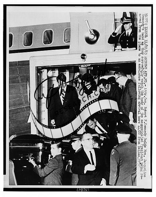 Atty. Gen. Robert F. Kennedy holds Mrs. Jacqueline Kennedy's hand as they sorrowfully watch the body of the assassinated President being removed from the plane to an ambulance following arrival here [Andrews Air Force Base] 11/22 from Dallas