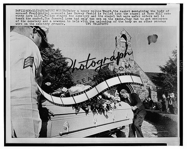 Under a heavy police guard, the casket containing the body of accused Presidential assassin Lee Harvey Oswald is rolled into the chapel at Rose Hill cemetery here [Fort Worth] 11/25