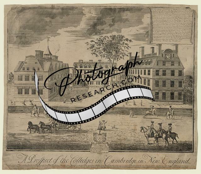 A prospect of the colledges in Cambridge in New England,courtyard,horse,wagon