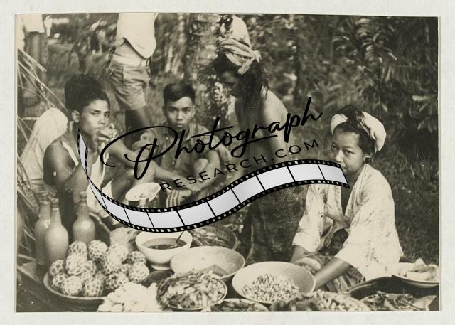 Balinese women and men with food in the marketplace, nude