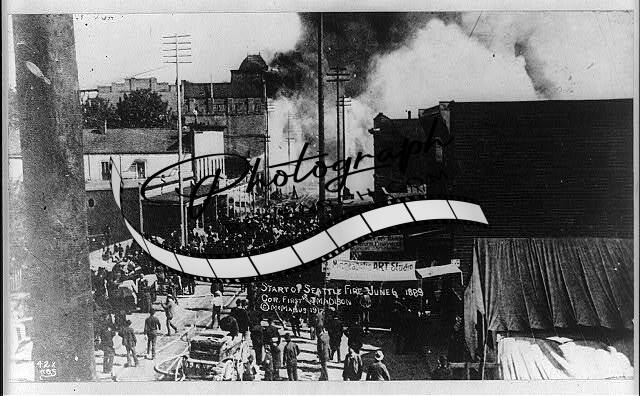 Start of Seattle fire,June 6,1889,Washington,black smoke,crowd on street,Madison