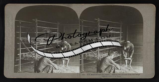 Silk manufacture in Japan. Taking the cocoons from the twigs
