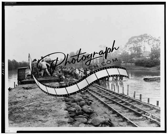 Workers unloading sandbags from railroad car,1927 Flood 1